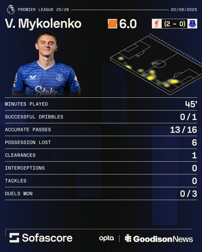 Ryan Gravenberch scored the opener, and Hugo Ekitike made it two—easily bypassing the Ukrainian defender. Mykolenko blocked one shot but failed to win any of the three duels he contested in a poor first half, according to Sofascore.