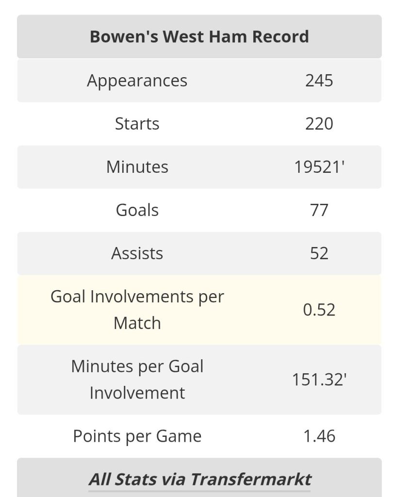 Since then, he’s only grown in stature. Now wearing the captain’s armband, Bowen has become not just a fan favourite, but a symbol of everything the club stands for — passion, work ethic, and flair.
