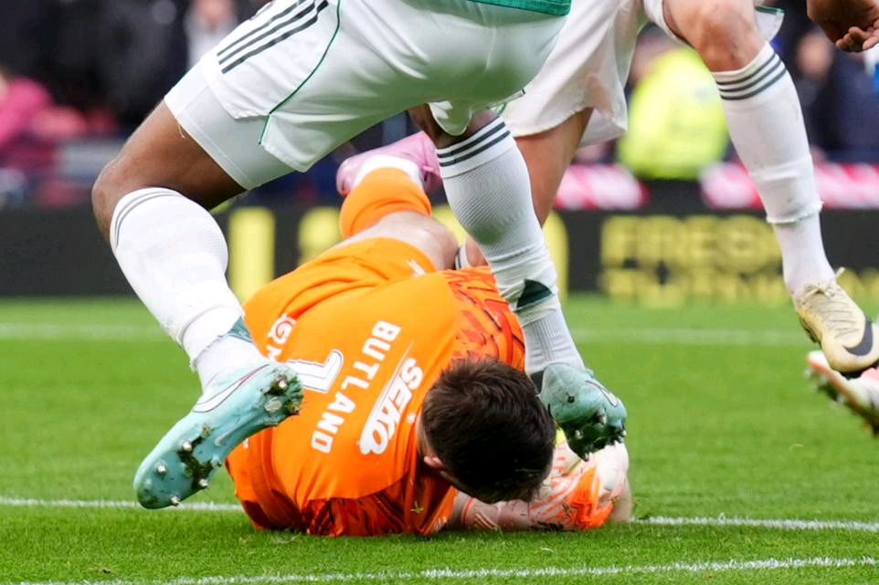 During the incident, Celtic defender Trusty and Rangers goalkeeper Butland both challenged for a loose ball, but Butland clearly got there first. Despite that, Trusty’s raised boot struck the keeper in the head — yet no red card was shown.
