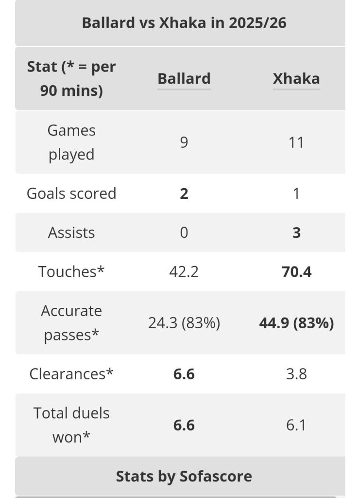 Ballard has become every bit the dependable warrior Xhaka is. The Northern Ireland international even fired home a stunning strike past David Raya recently, giving Sunderland a shock lead over league leaders Arsenal.