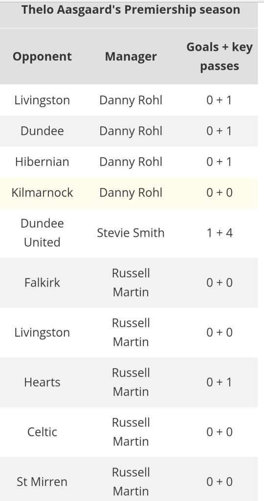 According to Sofascore, Aasgaard failed to take a single shot and created only one chance—none of them classed as a “big chance.” Across the Premiership season, he has yet to score or create more than one clear opportunity for any Rangers head coach.