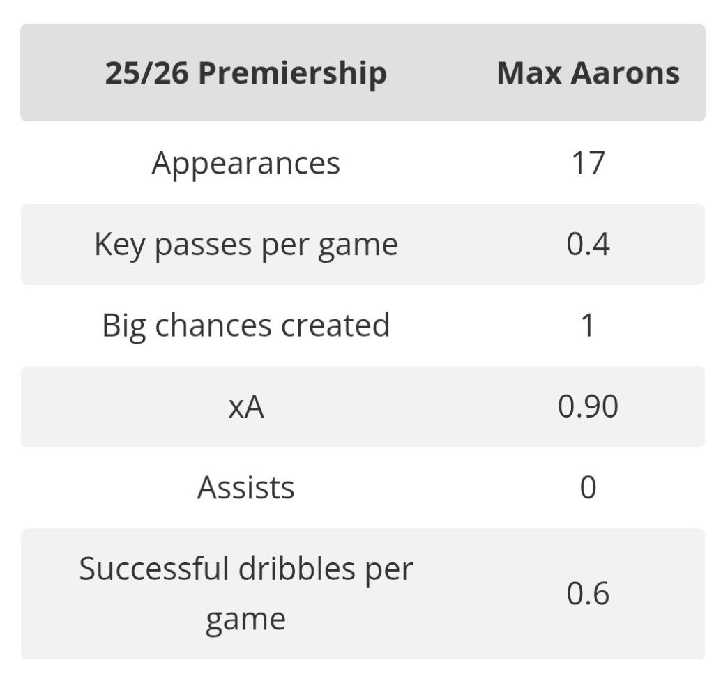 The former Norwich defender has struggled to contribute in attack this season. While tidy on the ball and making few defensive errors, Aarons has yet to register an assist in any competition and has only created one ‘big chance’ in the Premiership from eight starts.