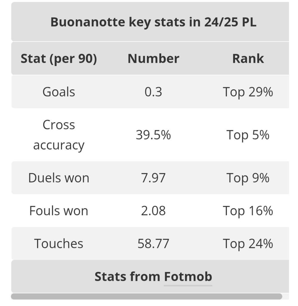 Buonanotte’s underlying stats are promising for Leeds’ style of play: 0.3 goals per 90 minutes and 39.5% cross accuracy at Leicester, ideal for a side that operates high and wide.